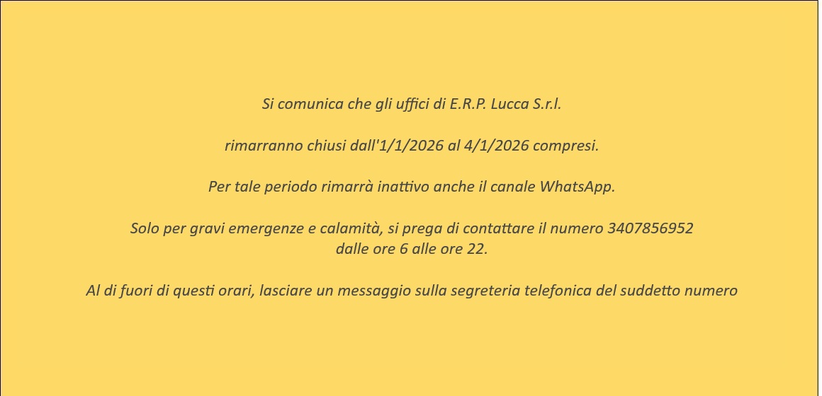 Si comunica che gli uffici di ERP Lucca S.r.l. rimarranno chiusi dal 2/1/2026 al 4/1/2026 compresi. Per tale periodo rimarrà inattivo anche il canale Whatsapp.